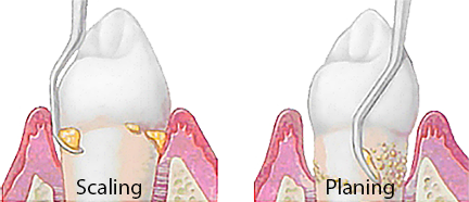 Scaling is the process by which dentists and hygienists remove bacterial plaque (Biofilms), calculus, stains, food debris and other accretions from the surfaces of the tooth. Root planing is a separate procedure that can be performed at the same time as scaling but is best performed at separate appointments from the initial scaling during multiple visits of periodontal therapy. Root planing is a definitive treatment procedure designed to remove cementum or surface dentin that is rough, impregnated with calculus, or contaminated with toxins or microorganisms. Root Planing is the process by which residual embedded calculus and disease root cementum are removed from the tooth surface to produce a smooth, hard and biologically clean surface which helps allow patient's oral tissues namely, the periodontal (gum) tissues, and supporting bone to repair, regenerate on the tooth root surfaces of the dentition. Root planing requires refined sharp smooth dental instruments made specifically for the procedure to create as close as possible a root surface smoothness once again, similar to the white enamel of a tooth, or a kitchen glass or other smooth surface that will minimize bacterial growth and help prevent repopulations of microorganisms on the root. The root surfaces during and after root planing should be tested for smoothness with special instruments.